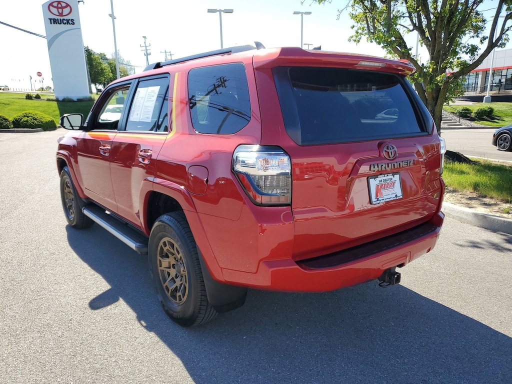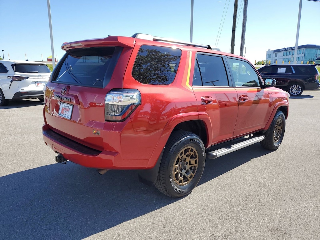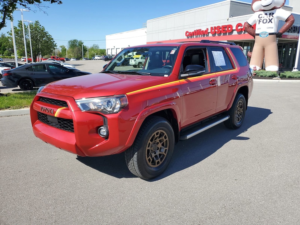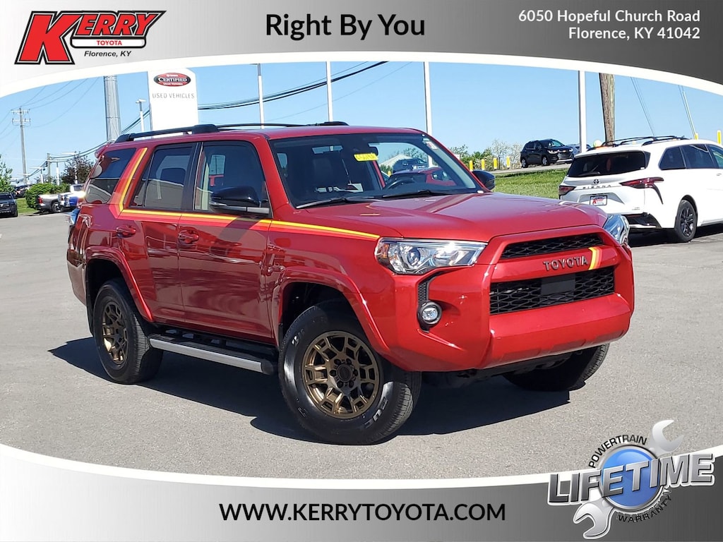 Proudly serving Cincinnati, Florence, Alexandria, Dayton, Hamilton, Dry Ridge, Lexington, Louisville, Nicholasville. Certified. Barcelona Red Metallic 2023 Toyota 4Runner 40th Anniversary Special Edition 4WD 5-Speed with ECT 4.0L V6 DOHC 24V 8 Speakers, All-Weather Floor Liners/Cargo Tray (PPO) (TMS), Alloy wheels, AM/FM radio: SiriusXM, Anniversary Edition, Apple CarPlay/Android Auto, Auto High-beam Headlights, Auto-dimming Rear-View mirror, Black Roof Rails, Brake assist, Bumpers: body-color, Electronic Stability Control, Emergency communication system: Safety Connect (1-year trial), Exterior Parking Camera Rear, Front Dual USB Power Port Charger (TMS), Front fog lights, Garage Door Opener, Garage door transmitter: HomeLink, Heated door mirrors, Heated Front Bucket Seats, Heated front seats, Heated Outside Rear-View Mirrors, Knee airbag, Leather Shift Knob, Leather steering wheel, Low tire pressure warning, Moonroof Package, Moonroof w/Tilt Up & Slide, Navigation System, Panic alarm, Passenger door bin, Power door mirrors, Power moonroof, Radio: Premium Audio w/Dynamic Navigation, Rear window wiper, Roof Rack Cross Bars (PPO) (TMS), Running Boards (PPO) (TMS), Security system, Speed control, Spoiler, Traction control, Turn signal indicator mirrors, Variably intermittent wipers, Wheels: 17" Bronze-Colored Alloy.