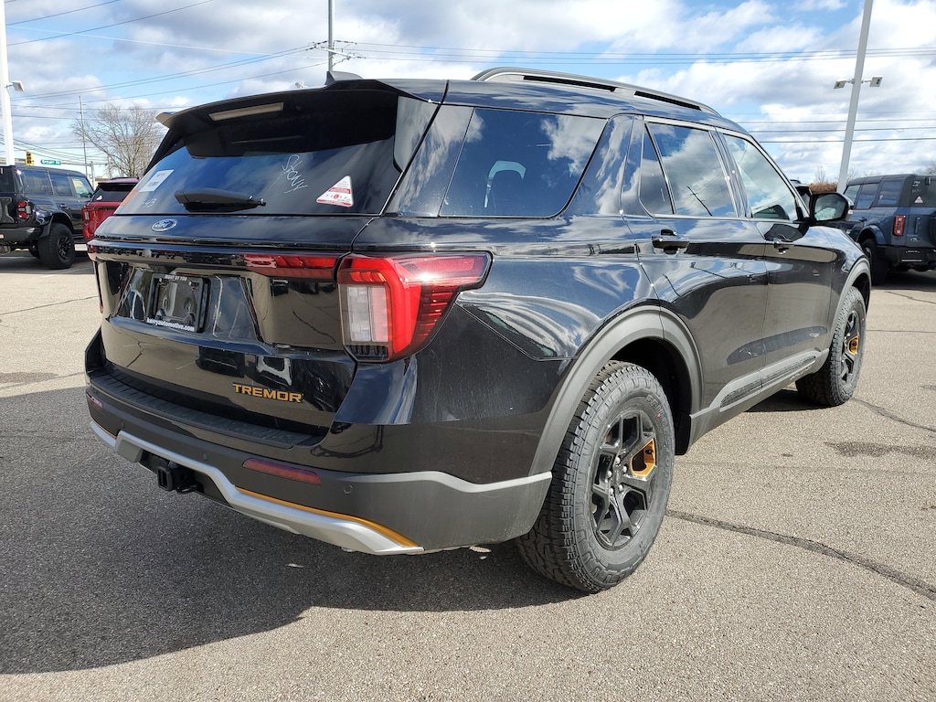 Black Metallic 2026 Ford Explorer Tremor 4WD 10-Speed Automatic 2.3L EcoBoost I-4 4WD, 3rd Row All-Weather Floor Liners with 2nd Row Captain's Charis, 3rd Row PowerFold Seats, Ambient Lighting, Auto-Dimming Interior Rear-View Mirror, BlueCruise (equipment + 1-Year + 90-Day Plan), BlueCruise Equipped (90-Day Trial), BlueCruise Hardware, Equipment Group 800A Standard Package, Ford Connectivity Package (one-Time Purchase - 7 Years), Heated/Ventilated Miko Suede Captain's Chairs, Manual-Folding Sideview Mirrors, Memory Driver's Seat, Radio: B&O Sound System by Bang and Olufsen, Rain-Sensing Wipers (front Only), Tremor Convenience Package, Wheels: 18" High Gloss Black-Painted Aluminum.