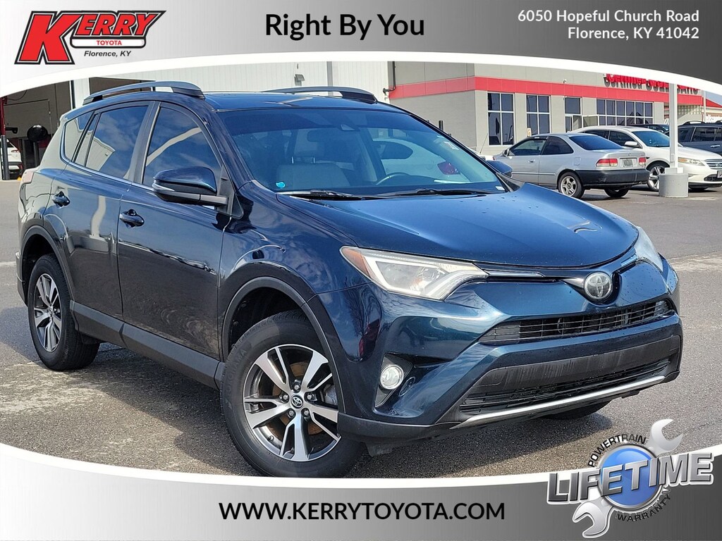 Proudly serving Cincinnati, Florence, Alexandria, Dayton, Hamilton, Dry Ridge, Lexington, Louisville, Nicholasville. Galactic Aqua Mica 2018 Toyota RAV4 XLE AWD 6-Speed Automatic 2.5L 4-Cylinder DOHC Dual VVT-i 6 Speakers, ABS brakes, Active Cruise Control, Alloy wheels, AM/FM radio, Auto High-beam Headlights, Blind Spot Monitor, Brake assist, Bumpers: body-color, CD player, Door Edge Guards, Electronic Stability Control, Exterior Parking Camera Rear, Front dual zone A/C, Front fog lights, Fully automatic headlights, Heated door mirrors, Illuminated entry, Knee airbag, Leather steering wheel, Low tire pressure warning, Panic alarm, Passenger door bin, Plus Extra Value Package, Power door mirrors, Power moonroof, Radio data system, Radio: Entune AM/FM/CD/MP3/WMA Playback w/6 Speakers, Radio: Entune Display Audio, Rear Backup Camera w/Monitor, Rear window wiper, Remote keyless entry, Roof Rails, Smart Key System, Speed control, Spoiler, Traction control, Turn signal indicator mirrors, Variably intermittent wipers, Wheels: 17" 5-Spoke Superchrome Alloy.