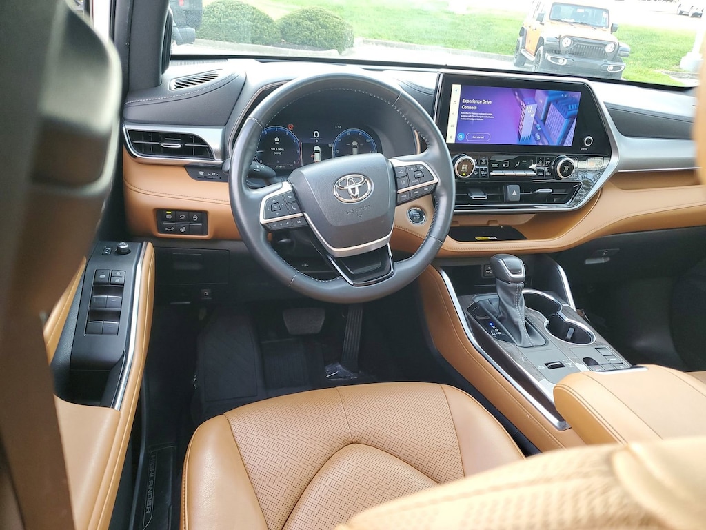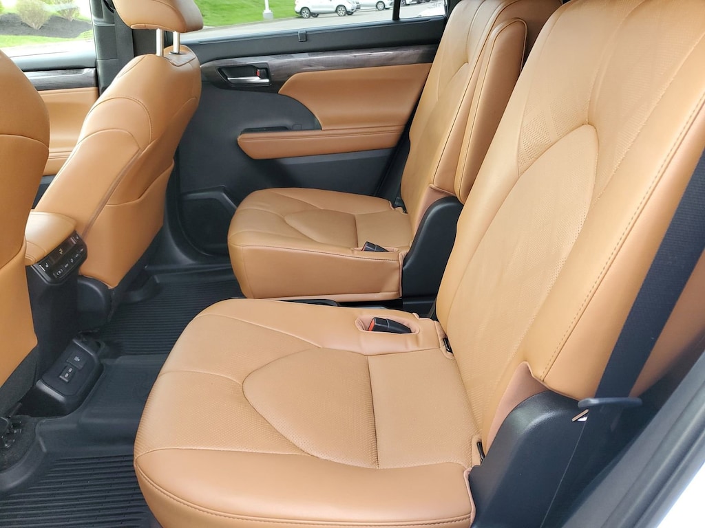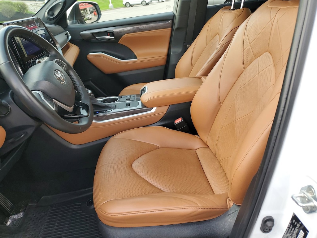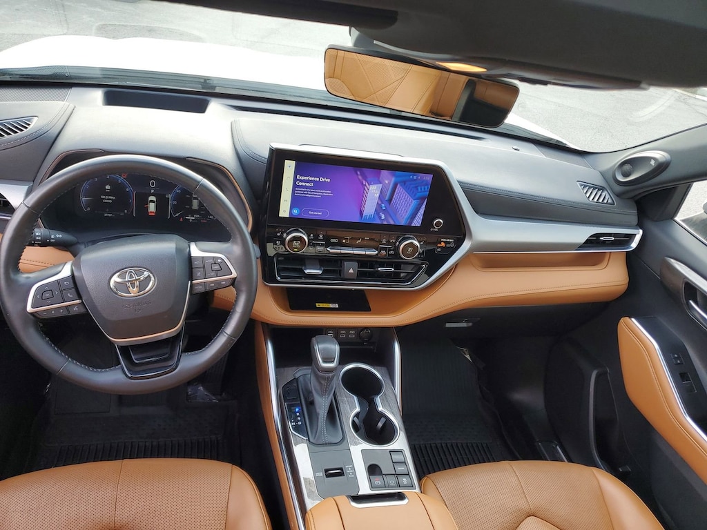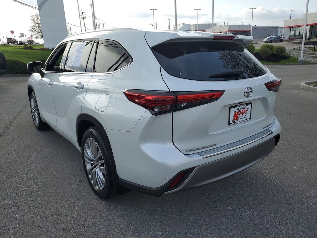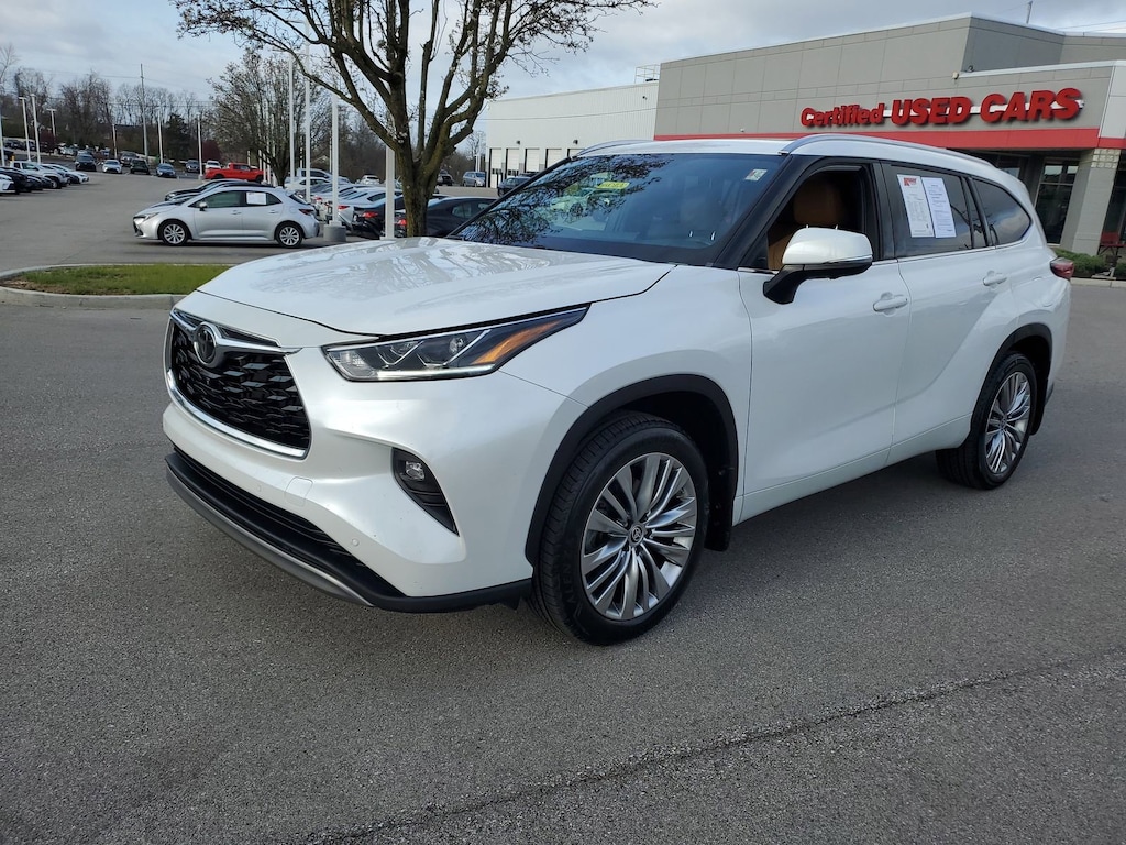 Proudly serving Cincinnati, Florence, Alexandria, Dayton, Hamilton, Dry Ridge, Lexington, Louisville, Nicholasville. Wind Chill Pearl 2023 Toyota Highlander Platinum FWD 8-Speed Automatic 2.4L I4 PDI Turbocharged DOHC 16V LEV3-SULEV30 265hp 11 Speakers, 20" Painted Alloy Wheels, ABS brakes, Active Cruise Control, Alloy wheels, AM/FM radio: SiriusXM, Apple CarPlay/Android Auto, Auto High-beam Headlights, Auto-dimming Rear-View mirror, Brake assist, Bumpers: body-color, Delay-off headlights, Digital Rearview Mirror w/HomeLink, Door Edge Guards (TMS), Electronic Stability Control, Emergency communication system: Safety Connect (up to 10-year trial subscription), Front dual zone A/C, Front fog lights, Fully automatic headlights, Garage door transmitter: HomeLink, Heads-Up Display, Heated door mirrors, Heated front seats, Heated rear seats, Heated steering wheel, Heated/Ventilated Front Bucket Seats, High Grade LED Projector Headlights, Illuminated entry, Knee airbag, Leather Seat Trim, Leather Shift Knob, Leather steering wheel, Low tire pressure warning, Memory seat, Mudguards (TMS), Navigation System, Navigation system: Drive Connect Cloud Navigation (1-year trial subscription), Panic alarm, Panoramic Moonroof, Passenger door bin, Power door mirrors, Power Liftgate, Power moonroof, Radio: 12.3" Toyota Audio Multimedia w/JBL Premium, Rain sensing wipers, Rear window wiper, Remote keyless entry, Roof rack: rails only, Security system, Speed control, Spoiler, Traction control, Turn signal indicator mirrors, Variably intermittent wipers, Ventilated front seats.