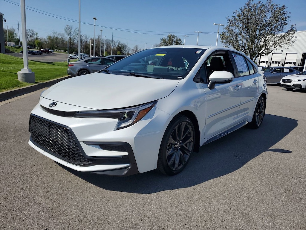 Proudly serving Cincinnati, Florence, Alexandria, Dayton, Hamilton, Dry Ridge, Lexington, Louisville, Nicholasville. Certified. Wind Chill Pearl 2025 Toyota Corolla SE FWD CVT 2.0L I4 DOHC 16V 6 Speakers, 7" Multi-Information Display, Alloy wheels, AM/FM radio: SiriusXM, Apple CarPlay/Android Auto, Auto High-beam Headlights, Black Badge Overlays, Blind Spot Monitor, Body Protecting Package: Color Keyed, Brake assist, Bumpers: body-color, Color-Keyed Heated Power Outside Mirrors, Delay-off headlights, Door Edge Guards, Electronic Stability Control, Emergency communication system: Safety Connect (up to 10-year trial subscription), Exterior Parking Camera Rear, Fully automatic headlights, Heated door mirrors, Knee airbag, Leather steering wheel, Low tire pressure warning, Mudguards, Panic alarm, Passenger door bin, Power door mirrors, Power Tilt/Slide Moonroof, Qi-Compatible Wireless Charger, Radio data system, Radio: 10.5" Toyota Audio Multimedia, Radio: 8" Toyota Audio Multimedia, Rear Spoiler, SE Premium Package, Speed control, Spoiler, Traction control, Turn signal indicator mirrors, Variably intermittent wipers, Wheels: 18" Alloy with Graphite-Colored Finish.